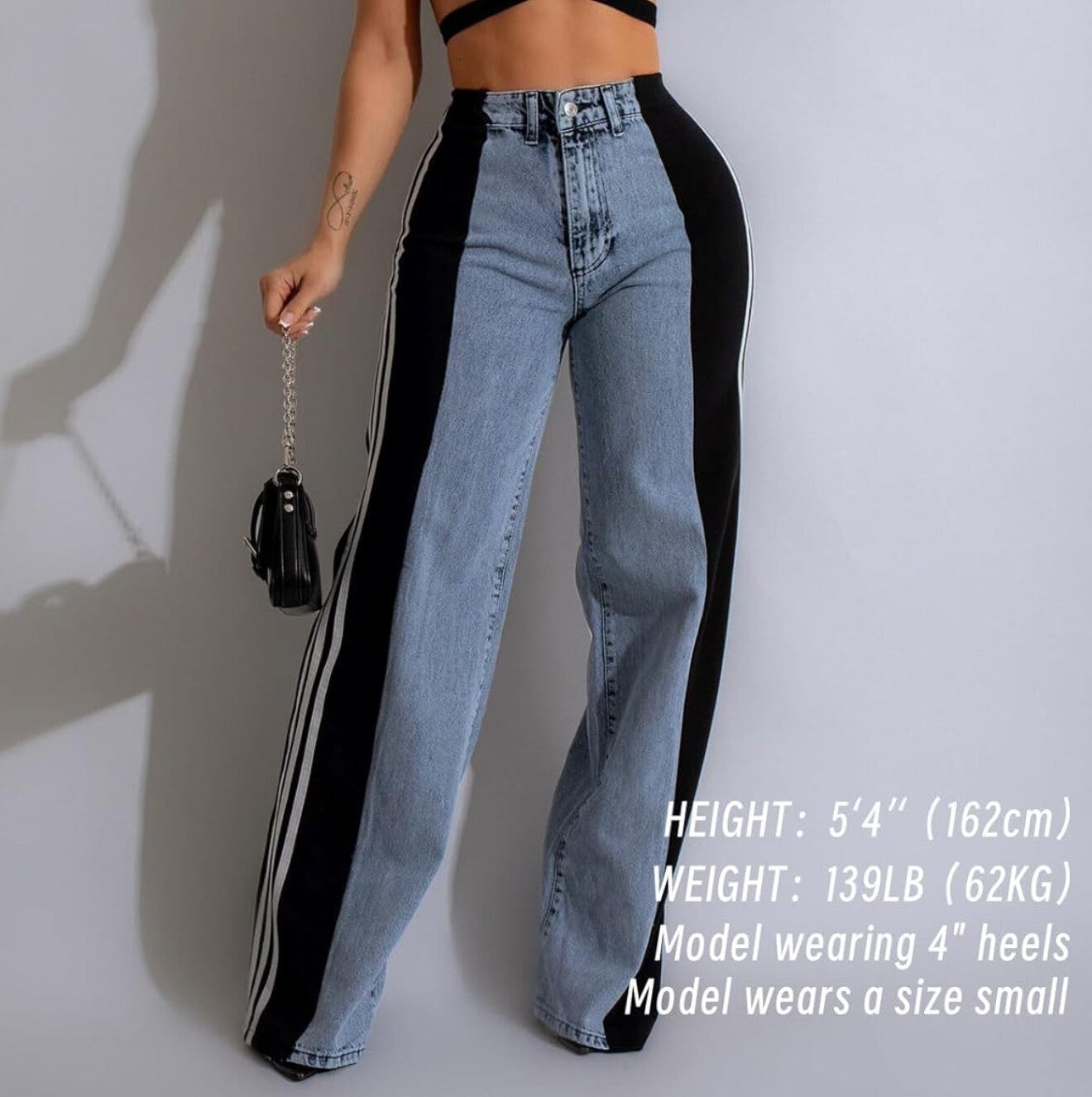 - 【Fashion Baggy Jeans】Elastic high rise straight leg jeans for women with two back pockets. Wide leg jeans made with patchwork that have three white stripes on the side and a button and zip fly.
