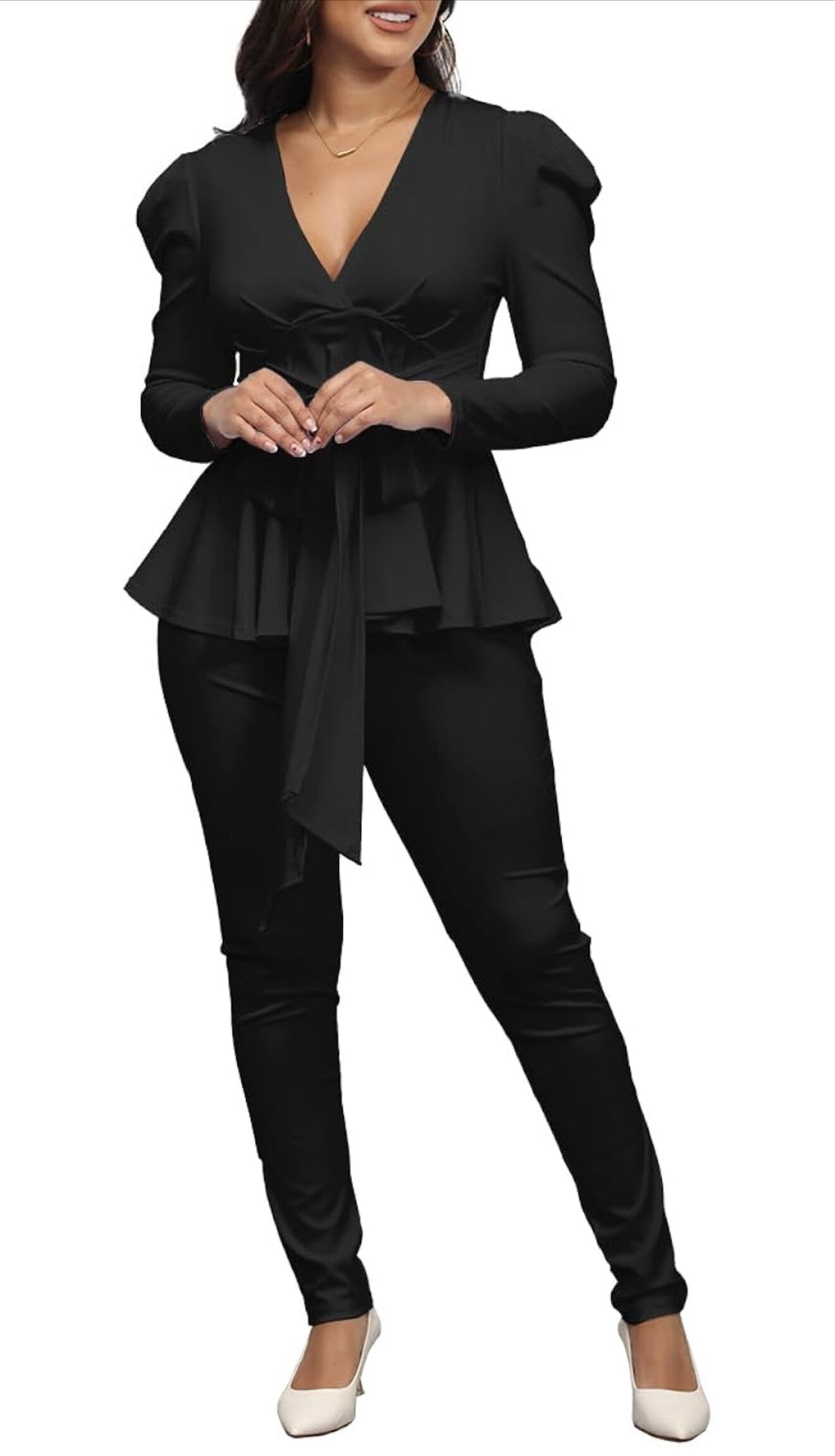 - Sexy Two Pieces Outfits: Bow Tie Front Slim Fit Ruffle Hem Top, Pencil Long Pants, Slim Fit, Fashion Boyfriend Style, Casual Business Suit Sets